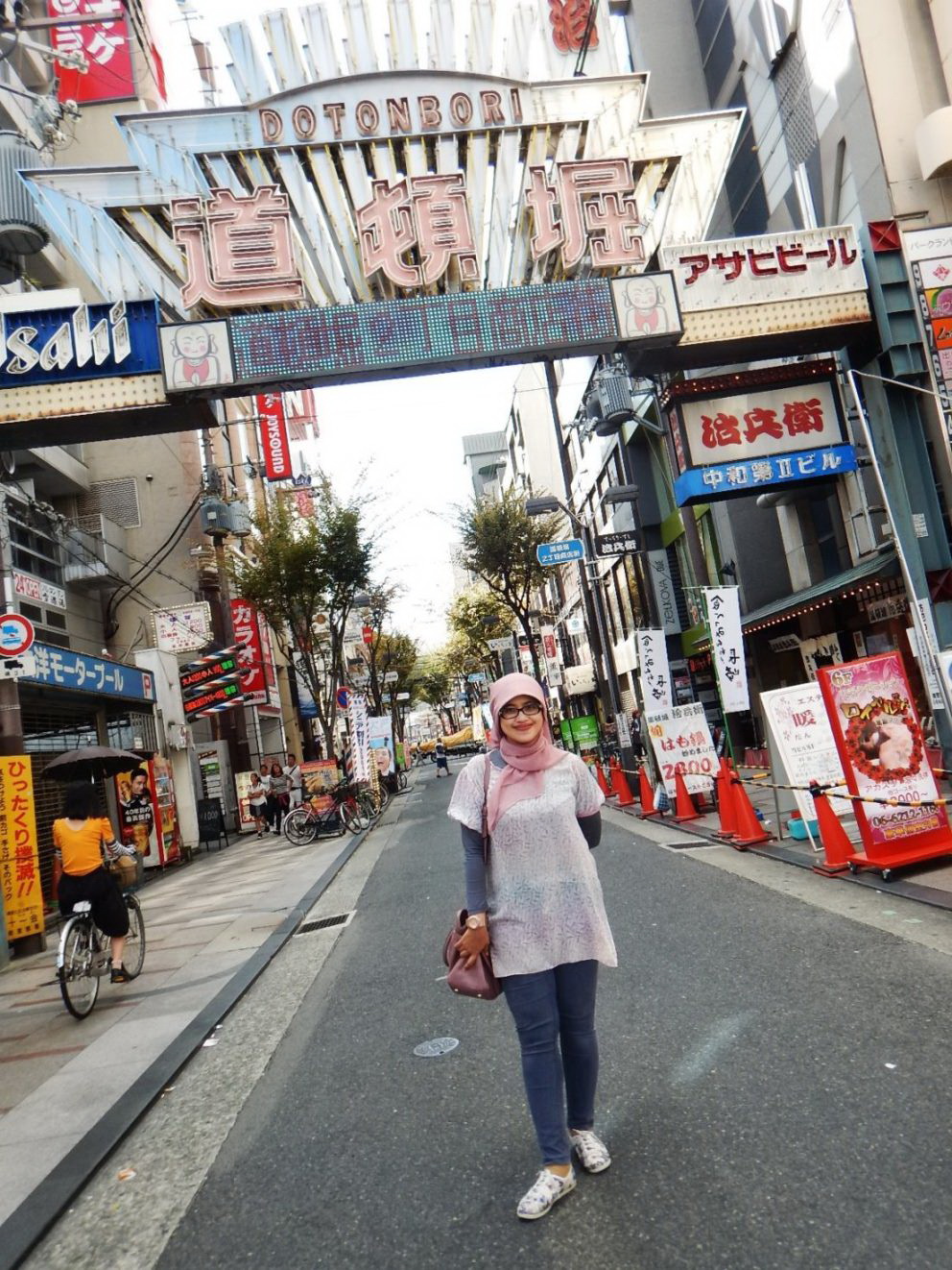 Tujuan berikutnya yaitu ke Dotonburi, yang merupakan pusat keramaian di Osaka. Dari Osaka castle kami naik subway ke Namba untuk menuju kawasan Dotonburi. Begitu sampai, tujuan kami adalah mencari icon Glicoman, entah penting atau tidak ini, ketika berjalan kaki kami menemukan Yoshinoya, dan karena sudah lumayan lapar kami pun makan siang dahulu di sini. So far, makan di Yoshinoya ini lah yang paling murah dan worth it, harganya tidak jauh berbeda dengan harga di Indonesia, kami menghabiskan 760 yen untuk berdua (sekitar IDR 45rb per orang), jika dibandingkan dengan restoran-restoran di Jepang pada umumnya ini jauh lebih murah, harga seporsi makanan biasanya minimal 1000 yen belum termasuk minum. Selepas makan siang kami berjalan dan bertemu dengan pasar makanan yang heboh dimana banyak makanan-makanan dan jajanan khas Jepang di sepanjang jalan seperti takoyaki, okonomiyaki, crab, dan lainnya dan tentunya toko-toko di sepanjang jalan ini mempunyai desain yang heboh dan unik hiasannya, spot foto yang menarik juga nih. Di sini kami membeli crab bakar seharga 700 yen (mahal ciiyynn) dengan porsi yang sedikit, lapar mata karena tokonya unik dan ramai. Awalnya kami ingin membeli takoyaki di tempat takoyaki yang kelihatannya terkenal dan ramai pengunjung. Namun ternyata di toko ini mereka juga menjual takoyaki pork, yang mengurungkan niat kami untuk membeli. Sebenarnya kalau difikir-fikir, agak aneh juga sih mereka menjual takoyaki pork karena tako merupakan bahasa Jepangnya octopus, kalau di dalamnya pork berarti bukan takoyaki lagi namanya, mungkin lebih tepat menjadi butanikuyaki.